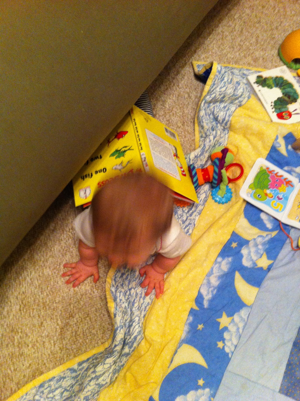 Molly has recently taken to lifting her belly off the ground and rocking back on her knees in preparation for crawling. Watch and learn, little Michael Holt! ;p